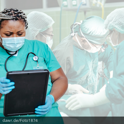 Dieses Bild zeigt eine Krankenschwester mit einer Patientenakte vor einer OP-Szene.