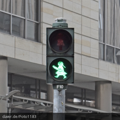 Dieses Foto zeigt eine grüne Fußgängerampel, welche die Ampelfrau (die weibliche Version des berühmten ostdeutschen Ampelmännchens) als Symbolik verwendet. Diese Darstellungsform wurde erst 1996 vom Graphiker Hans-Jürgen Ellenberger im Sinne der Geschlechtergerechtigkeit entworfen und wird allerdings nur von wenigen Städten bei Lichtsignalanlagen verwendet.