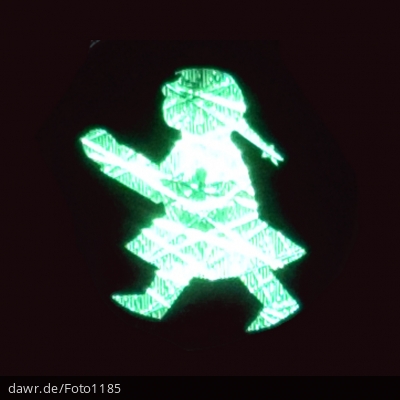 Dieses Foto zeigt eine grüne Ampelfrau (die weibliche Version des berühmten ostdeutschen Ampelmännchens), wie Sie nur von wenigen Städten für Fußgängerampeln verwendet werden.