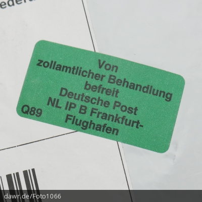 Dieses Foto zeigt einen Aufkleber mit der Aufschrift „Von zollamtlicher Behandlung befreit“, wie er von der Deutschen Post am Frankfurter Flughafen benutzt wird. Solche Aufkleber findet man oft auf Paketen aus Nicht-EU-Ländern. Er besagt, dass das Paket geprüft wurde und für den Inhalt keine (Einfuhr)Zölle zu entrichten sind.