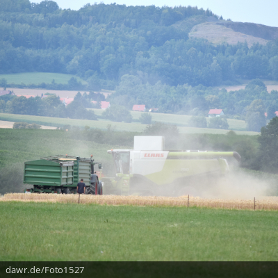 Dieses Foto zeigt einen Mähdrescher und einen Traktorgespann bei der Kornernte im Spätsommer. Für Themen wie Ernteausfälle oder Agrarsubventionen wäre dieses Bild eine passende Illustration.