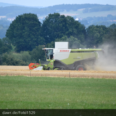 Dieses Foto zeigt einen Mähdrescher bei der Kornernte im Spätsommer. Für Themen wie Ernteausfälle oder Agrarsubventionen wäre dieses Bild eine passende Illustration.