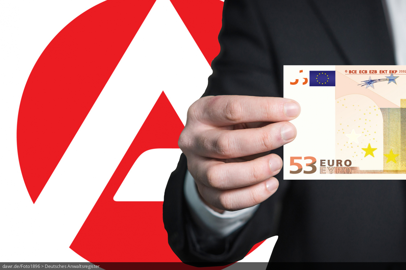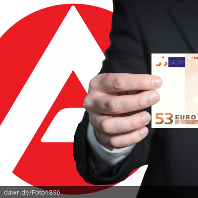 Dieses Bild zeigt teilweise einen Mann im Anzug, welcher einen 53 Euroschein festhält. Im Hintergrund ist das Logo der Agentur für Arbeit zu sehen.