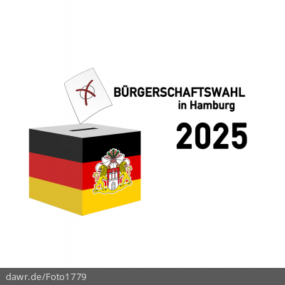 Diese Grafik zeigt die Zeichnung einer Wahlurne, welche in den deutschen Nationalfarben schwarz-rot-gold gefärbt und mit dem Wappen von Hamburg dekoriert wurde. Über der Box schwebt ein angedeuteter Wahlzettel, welcher mit einem symbolisch angekreuzten Feld, wie es auf Wahlscheinen benutzt wird, ergänzt wurde. Daneben steht der Schriftzug „Bürgerschaftswahl in Hamburg 2025“.