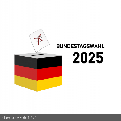 Diese Grafik zeigt die Zeichnung einer Wahlurne, welche in den deutschen Nationalfarben schwarz-rot-gold gefärbt wurde. Über der Box schwebt ein angedeuteter Wahlzettel, welcher mit einem symbolisch angekreuzten Feld, wie es auf Wahlscheinen benutzt wird, ergänzt wurde. Daneben steht der Schriftzug „Bundestagswahl 2025“.