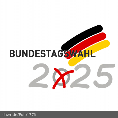 Diese Grafik zeigt einen Schriftzug „Bundestagswahl 2025“, welcher mit einem symbolisch angekreuzten Feld, wie es auf Wahlscheinen benutzt wird, und einer Deutschlandfahne ergänzt wurde.