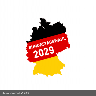 Diese Grafik zeigt eine Grundriss von Deutschland, welcher in den deutschen Nationalfarben schwarz-rot-gold gefärbt wurde. Beschriftet wurde das Bild mit „Bundestagswahl 2029“.