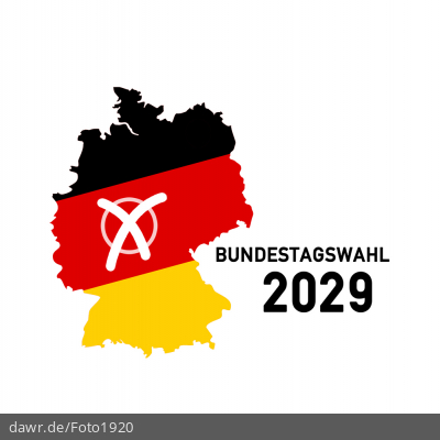 Diese Grafik zeigt eine Grundriss von Deutschland, welcher in den deutschen Nationalfarben schwarz-rot-gold gefärbt wurde. Ergänzt wurde die Landkarte mit einem symbolisch angekreuzten Feld, wie es auf Wahlscheinen benutzt wird. Daneben steht der Schriftzug „Bundestagswahl 2029“.