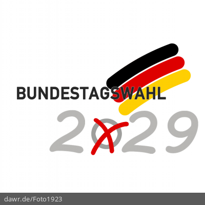Diese Grafik zeigt einen Schriftzug „Bundestagswahl 2029“, welcher mit einem symbolisch angekreuzten Feld, wie es auf Wahlscheinen benutzt wird, und einer Deutschlandfahne ergänzt wurde.