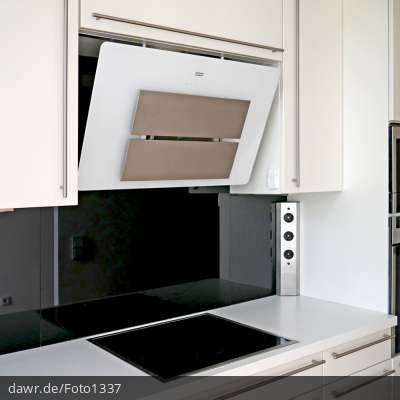 Das Foto zeigt eine moderne Einbauküche mit Schrägabzugshaube über dem Herd und seperat installiertem Backofen.
