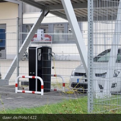 Dieses Foto zeigt eine Ladestation für Elektrofahrzeuge auf dem Gelände eines Stadtwerkes, wie sie in vielen Städten errichtet werden. Zum Zeitpunkt der Aufnahme wird gerade ein Elektro-Auto an dieser Station geladen.