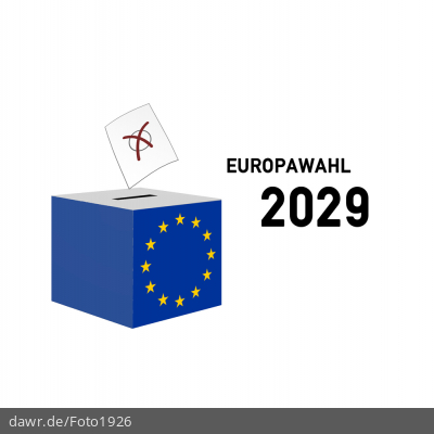 Diese Grafik zeigt die Zeichnung einer Wahlurne, welche im blau der Europäischen Union gefärbt und mit dem passenden Wappen dekoriert wurde. Über der Box schwebt ein angedeuteter Wahlzettel, welcher mit einem symbolisch angekreuzten Feld, wie es auf Wahlscheinen benutzt wird, ergänzt wurde. Daneben steht der Schriftzug „Europawahl 2029“.