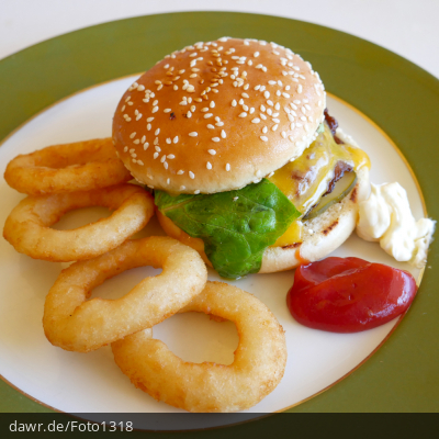 Dieses Foto zeigt ein typisches Fastfood-Gericht: einen Cheeseburger mit Zwiebelringen dazu Ketchup und Majonaise.