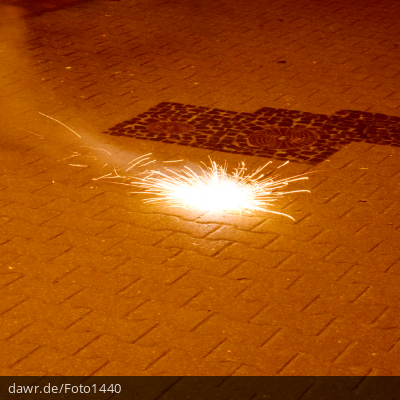 Dieses Foto zeigt einen sich drehenden Kreisel auf einem Pflasterweg, wie er zu Silvester als Feuerwerk gern genutzt wird. Dieses Bild eignet sich gut als symbolische Darstellung für die Themen Silvester und Feuerwerk.