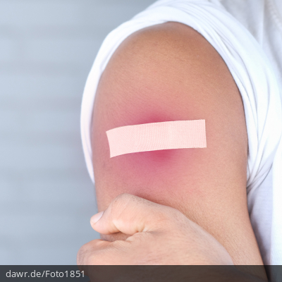 Dieses Foto zeigt den Oberarm einer Person, mit einer starken Hautrötung, auf dem ein Pflaster aufklebt wurde.