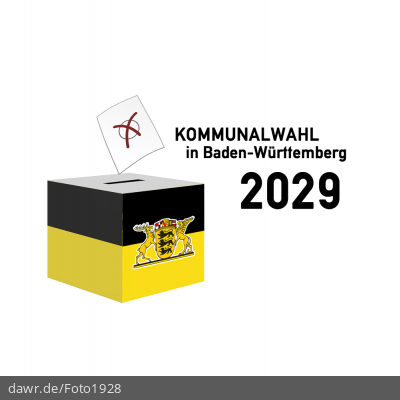 Diese Grafik zeigt die Zeichnung einer Wahlurne, welche in den Landesfarben von Baden-Württemberg gefärbt und mit dem passenden Wappen dekoriert wurde. Über der Box schwebt ein angedeuteter Wahlzettel, welcher mit einem symbolisch angekreuzten Feld, wie es auf Wahlscheinen benutzt wird, ergänzt wurde. Daneben steht der Schriftzug „Kommunalwahl in Baden-Württemberg 2029“. Eine solche Grafik eignet sich gut als symbolische Darstellung für die Kommunalwahl im Frühjahr 2029.