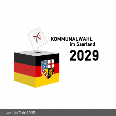 Diese Grafik zeigt die Zeichnung einer Wahlurne, welche in den deutschen Nationalfarben schwarz-rot-gold gefärbt und mit dem Wappen des Saarlands dekoriert wurde. Über der Box schwebt ein angedeuteter Wahlzettel, welcher mit einem symbolisch angekreuzten Feld, wie es auf Wahlscheinen benutzt wird, ergänzt wurde. Daneben steht der Schriftzug „Kommunalwahl im Saarland 2029“. Eine solche Grafik eignet sich gut als symbolische Darstellung für die Kommunalwahl im Frühjahr 2029.