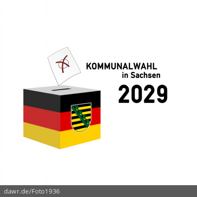 Diese Grafik zeigt die Zeichnung einer Wahlurne, welche in den deutschen Nationalfarben schwarz-rot-gold gefärbt und mit dem Wappen von Sachsen dekoriert wurde. Über der Box schwebt ein angedeuteter Wahlzettel, welcher mit einem symbolisch angekreuzten Feld, wie es auf Wahlscheinen benutzt wird, ergänzt wurde. Daneben steht der Schriftzug „Kommunalwahl in Sachsen 2024“.