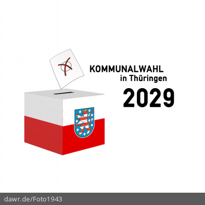 Diese Grafik zeigt die Zeichnung einer Wahlurne, welche in den Landesfarben von Thüringen gefärbt und mit dem passenden Wappen dekoriert wurde. Über der Box schwebt ein angedeuteter Wahlzettel, welcher mit einem symbolisch angekreuzten Feld, wie es auf Wahlscheinen benutzt wird, ergänzt wurde. Daneben steht der Schriftzug „Kommunalwahl in Thüringen 2029“. Eine solche Grafik eignet sich gut als symbolische Darstellung für die Kommunalwahl im Frühjahr 2029.