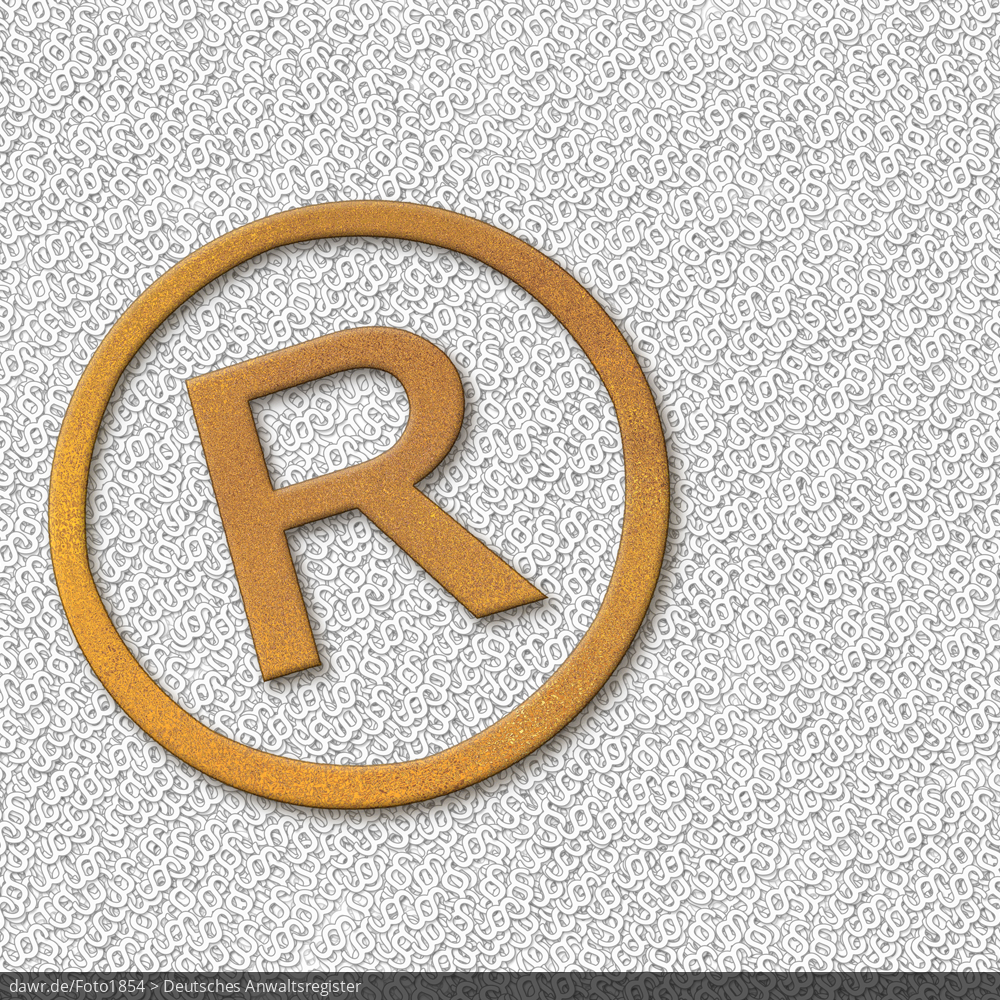 Diese Grafik zeigt ein großes R in einem Kreis (wird im anglo-amerikanischen Recht für eine geschütze Marke verwendet) vor einem Hintergrund, welcher aus vielen kleinen Paragraphenzeichen besteht.