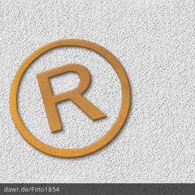 Diese Grafik zeigt ein großes R in einem Kreis (wird im anglo-amerikanischen Recht für eine geschütze Marke verwendet) vor einem Hintergrund, welcher aus vielen kleinen Paragraphenzeichen besteht. Diese Darstellung eignet sich gut für Themen im Zusammenhang mit Markenrechtsverletzungen.