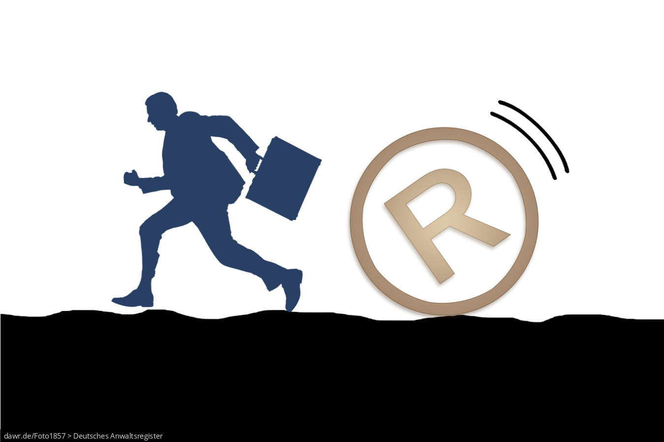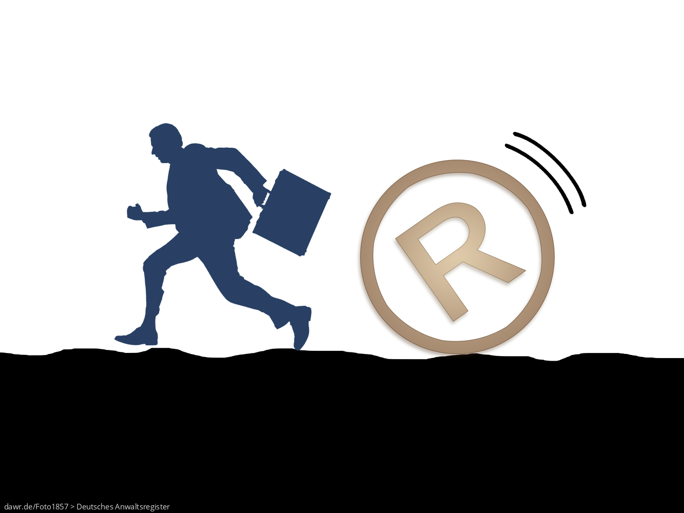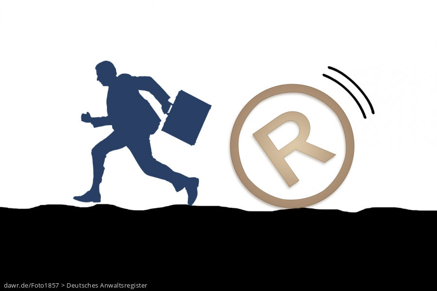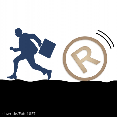 Diese Grafik zeigt die Silhouette eines Mannes, der von einem großen R in einem Kreis (wird im anglo-amerikanischen Recht für eine geschütze Marke verwendet) verfolgt wird.