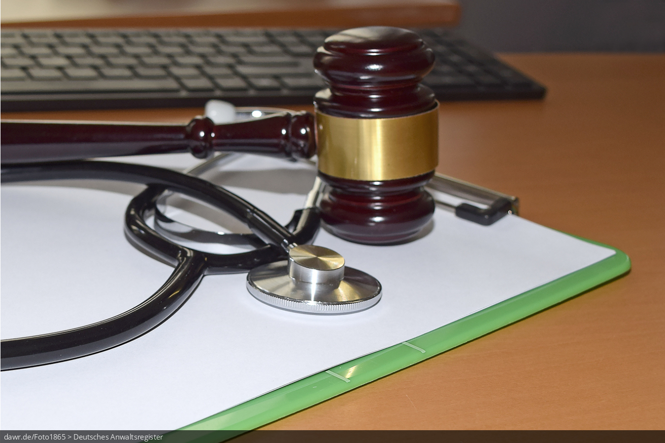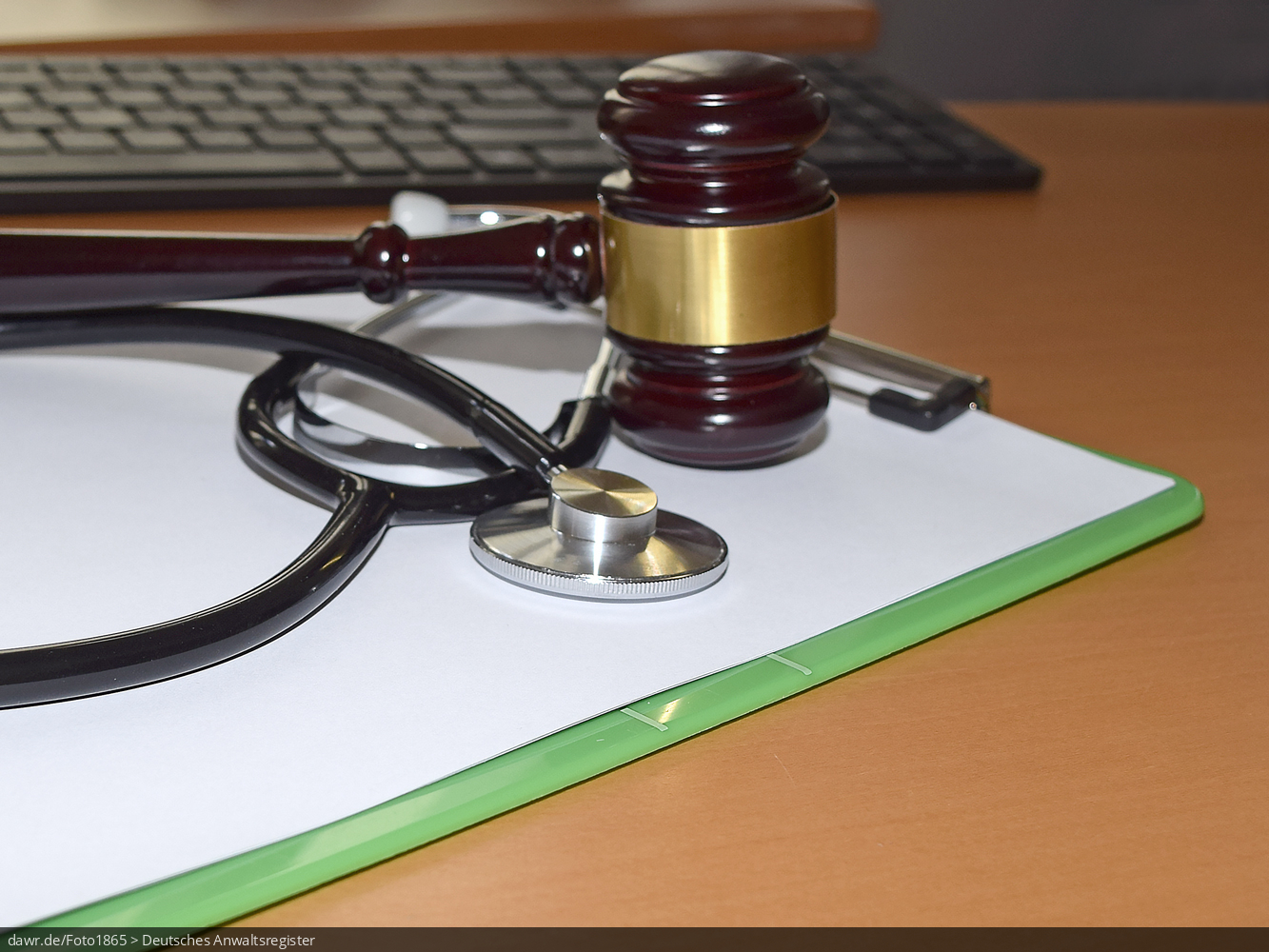 Dieses Foto zeigt ein Klemmbrett, welches vor einer Tastatur liegt. Darauf liegt ein Richterhammer und ein Stethoskop. Diese Darstellung eignet sich gut für rechtliche Themen im Zusammenhang mit medizinischen Fragen.