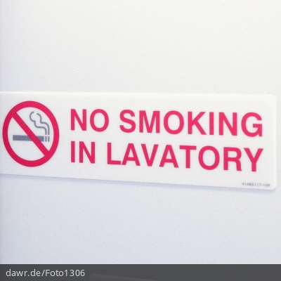 Das Foto zeigt ein Schild, wie es sich an Flugzeugtoiletten befindet und auf das geltende Rauchverbot hinweist.