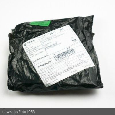 Dieses Foto zeigt ein kleines Paket, welches von China nach Deutschland versendet wurde. Gut zu erkennen ist der Aufkleber bez. der zollamtliche Befreiung durch die Deutsche Post am Frankfurter Flughafen.