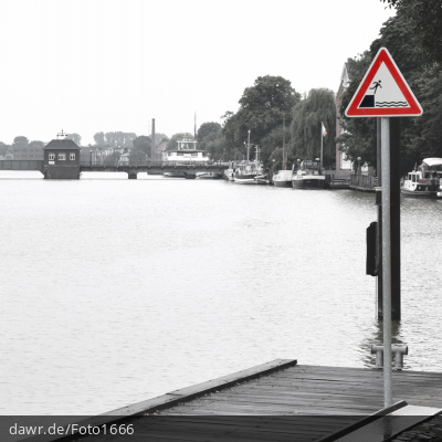 Dieses Foto zeigt einen Steg am Ufer eines Flusses, welche passend mit einem Warnschild „Achtung Absturzgefahr“ ergänzt wurde.