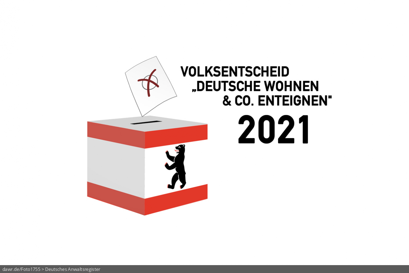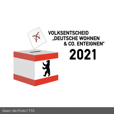 Diese Grafik zeigt die Zeichnung einer Wahlurne, welche in den Landesfarben von Berlin gefärbt und mit dem passenden Berliner Bären dekoriert wurde. Über der Box schwebt ein angedeuteter Wahlzettel, welcher mit einem symbolisch angekreuzten Feld, wie es auf Wahlscheinen benutzt wird, ergänzt wurde. Daneben steht der Schriftzug „Volksentscheid „Deutsche Wohnen & Co. enteignen“ in Berlin 2021“. Eine solche Grafik eignet sich gut als symbolische Darstellung für den Volksentscheid über einen Beschluss zur Erarbeitung eines Gesetzentwurfs durch den Senat zur Vergesellschaftung der Wohnungsbestände großer Wohnungsunternehmen im September 2021.