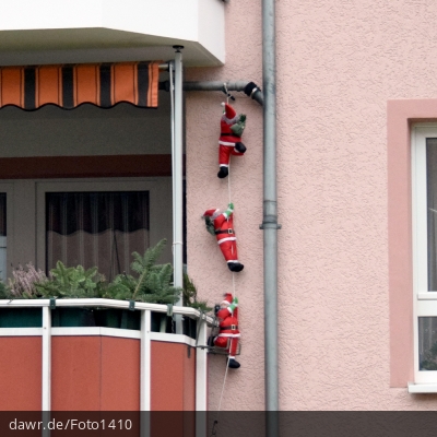 Dieses Foto zeigt drei Weihnachtsmänner, welche an einen Seil die Fassade eines Mehrfamilienhauses hochklettern. In der heutigen Zeit sind solche Figuren eine gern genutzte Weihnachtsdekoration.