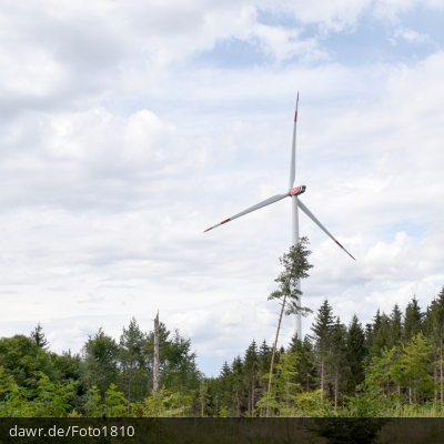 Dieses Bild zeigt eine Windkraftanlage in einem Waldgebiet. Es ergibt sich so ein passendes Bild für Themen rund um erneuerbare Energien, Windkraft oder allgemein der umweltfreundlichen Stromerzeugung.