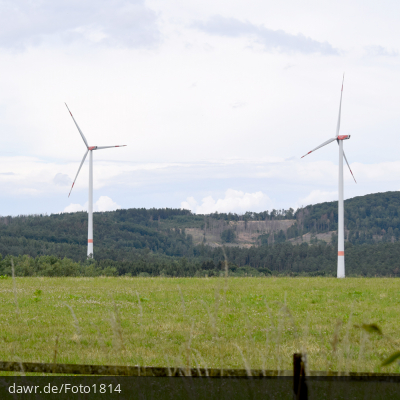 Dieses Bild zeigt zwei Windkraftanlagen auf einer Wiese mit einem umfangreichen Waldgebiet im Hintergrund.