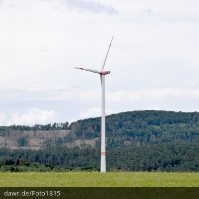 Dieses Bild zeigt eine Windkraftanlage auf einer Wiese mit einem umfangreichen Waldgebiet im Hintergrund.