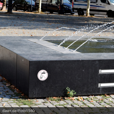 Dieses Foto zeigt einen Springbrunnen in einer Großstadt, an den ein Aufkleber zu finden ist, dass das Wasser im Brunnen nicht trinkbar ist.